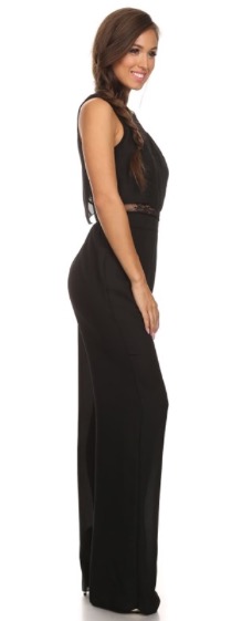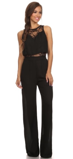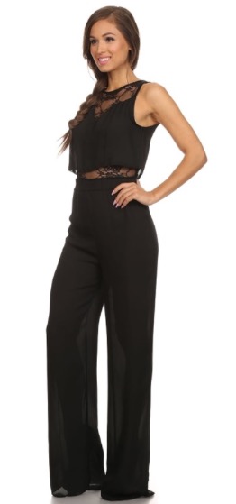 Sleeveless jumpsuit with lace knit bodice with solid chiffon overlay, slit back detail, banded waist, and wide leg pants. Button closure at back.